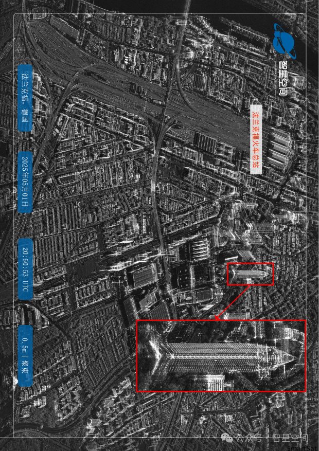 在济高科创号(智星二号A星)SAR卫星视角下,法兰克福火车总站的繁忙跃然眼前。纵横交错的铁轨如钢铁动脉,24台24线的复杂布局以独特纹理清晰呈现,巨大拱形玻璃顶棚在图像中闪耀着现代建筑的独特美感。不远处,德国曾经的“天际线王者”、高达256米的法兰克福博览塔,其经典三段式结构、方形基座延伸出的塔轴,以及塔顶圆柱与三层金字塔的融合造型,都被SAR卫星精准捕捉,即使在恶劣天气下,也能清晰展现其标志性轮廓与细节。